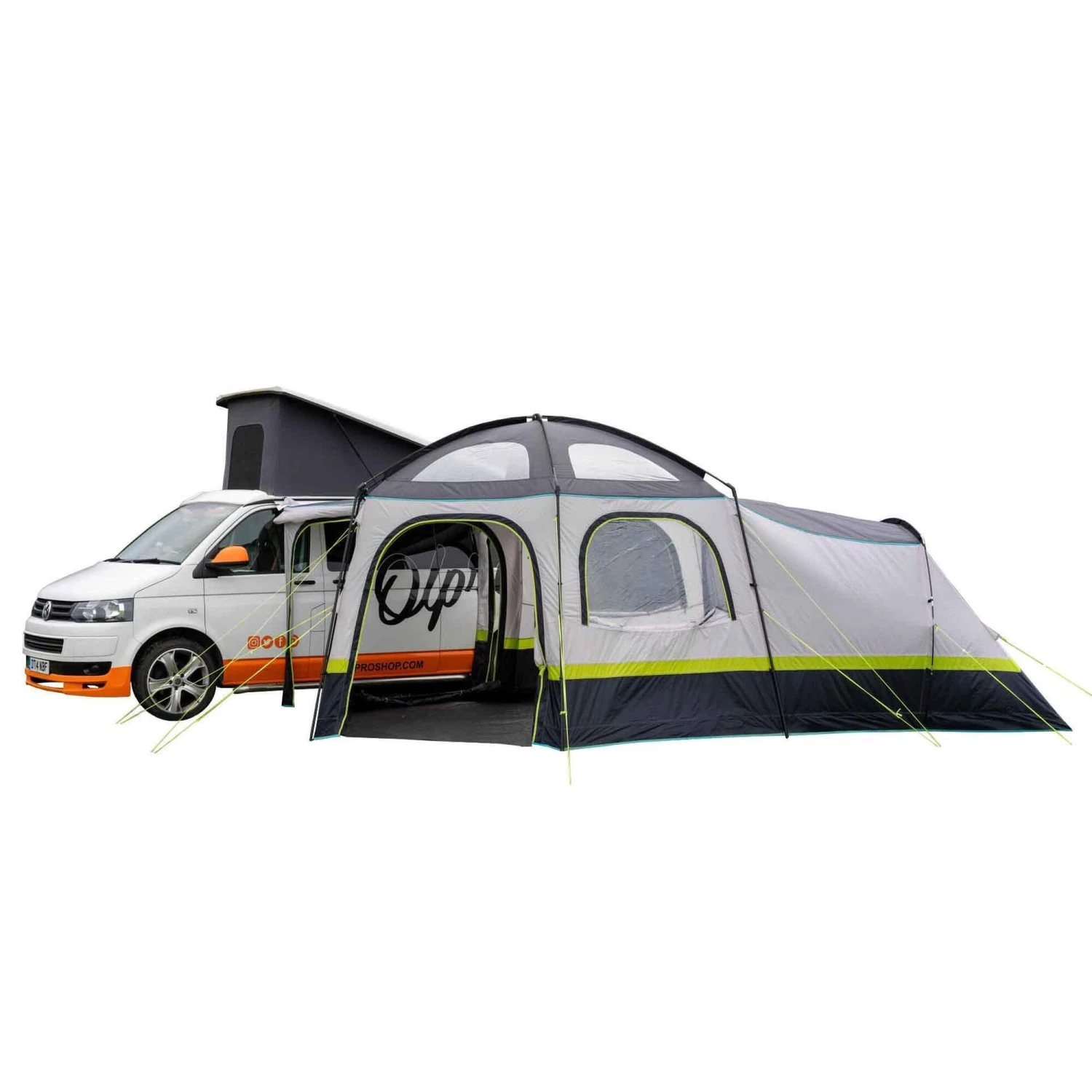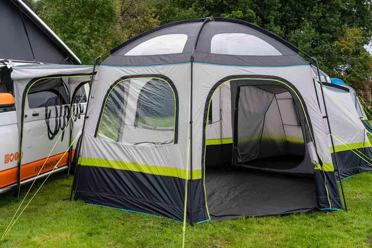 The tunnel has two access doors so no need to walk through the awning to get to the van and the sleeping pod has an extra large inner tent that will fit a double air bed or can be removed to enlarge your living space. The awning is made from an above-standard 190T Rip-stop, fully waterproof material, with a rating of 5000 Hydrostatic Head and it also has fully taped seams. The poles are a mix of steel and fibreglass, providing extra stability. The front door has the benefit of a fly mesh screen for added privacy and to protect you from those pesky bugs.