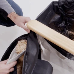 – Put a 40 or 50 litre rubbish bag inside the beige bag by turning the edges of the rubbish bag over the outside of the beige bag.