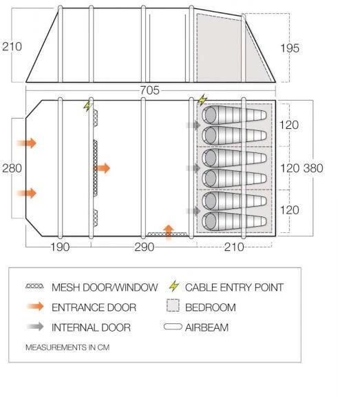 The Lismore Air 600XL, 6-man tent is an inflatable AirBeam tent with additional living space and integrated awning, providing a large and versatile home from home. The large Diamond Clear Windows let light pour into the living areas during the day and can be covered up with the roll-away toggled curtains at night. The fully sewn-in groundsheet keeps out draughts and bugs, whilst ventilation can be managed using the mesh doors and AirZone panels. At over 2m tall, it’s easy to stand-up and move around. The large front door can be unzipped to the midpoint, or fully across, giving a good variety of options to suit different conditions and uses. You can even sleep-in longer on summer mornings, thanks to the Nightfall bedroom inner tent, designed to minimise the morning light.